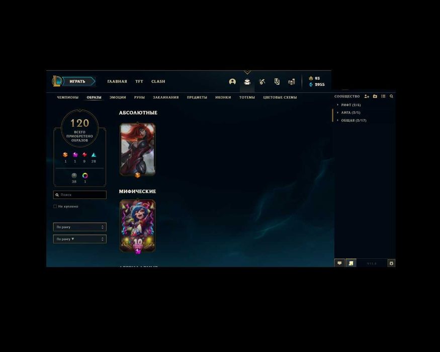 ✨Кол-во скинов: 120 (1 абсолютный скин мисс фортуна , мифический энни , 9 легендарных , 28 эпических,