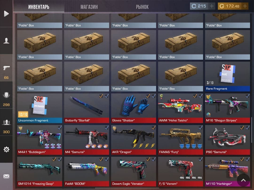 💰Голда: 172.48; 🧤Перчатки: "Shatter"; 🔪Ножи: Butterfly "Starfall" ⭐️Редкие скины: 13